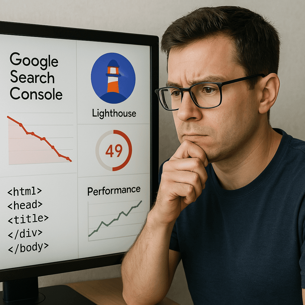 Ferramentas como Google Search Console e Lighthouse mostram erros críticos e oportunidades de melhoria.